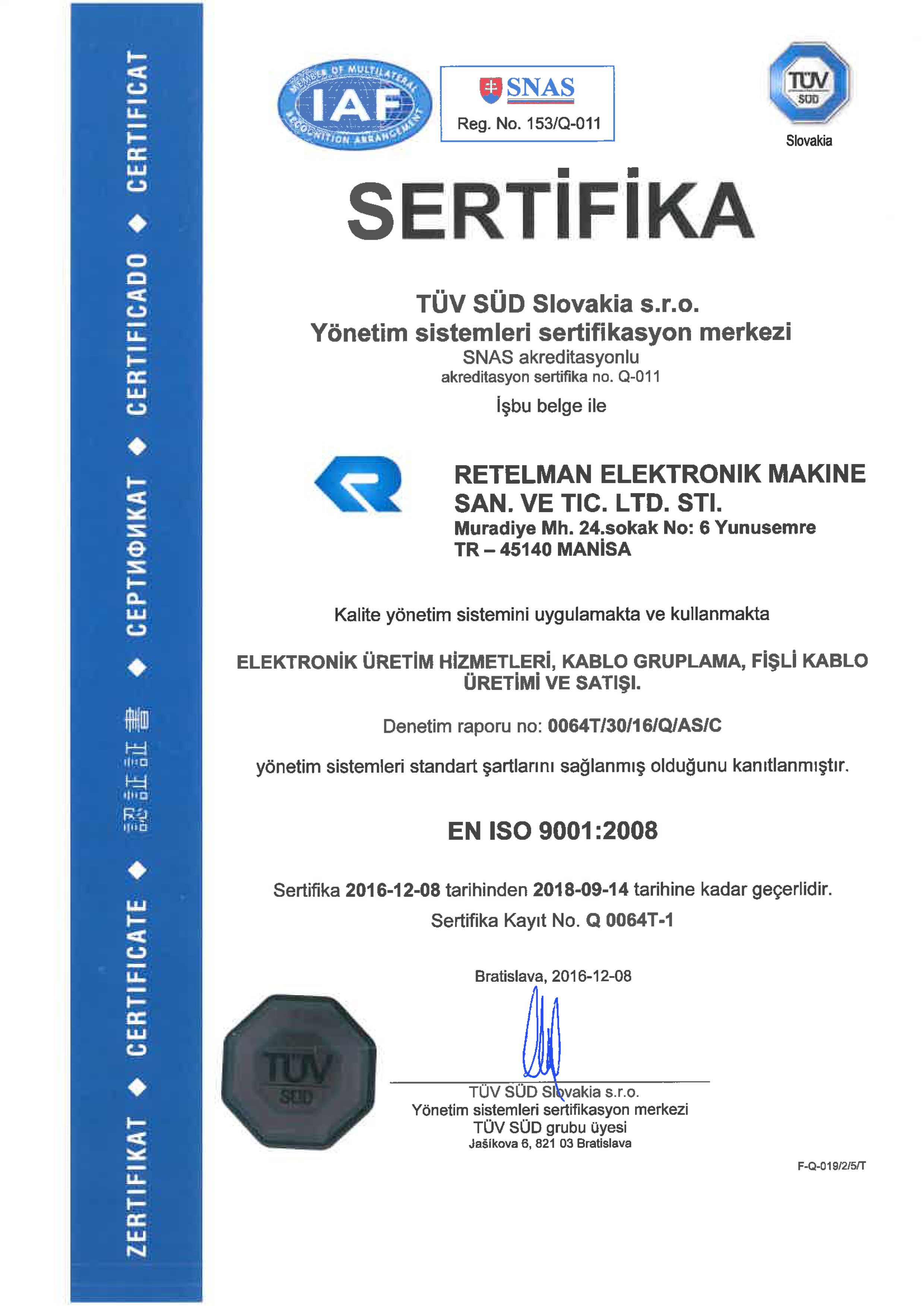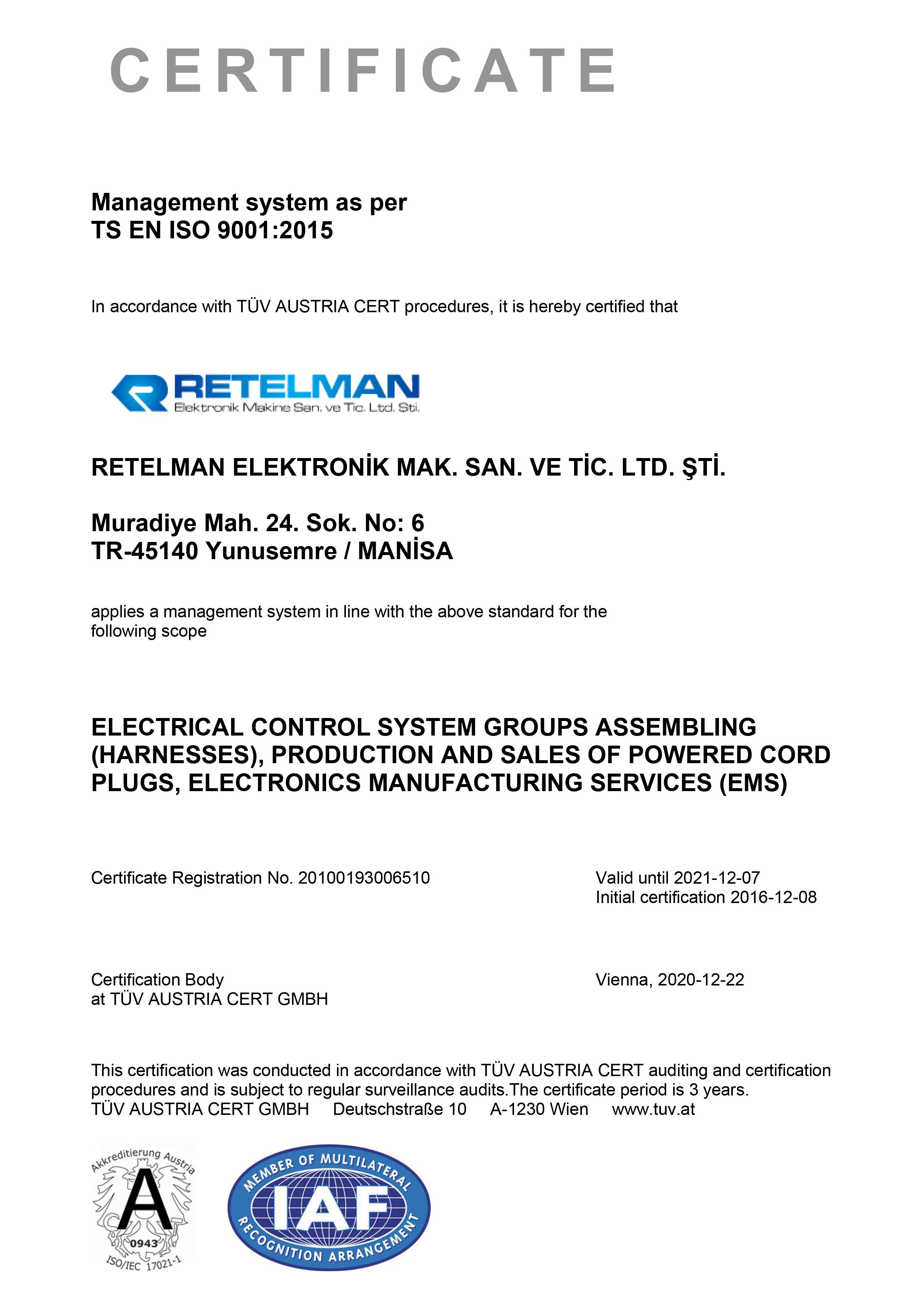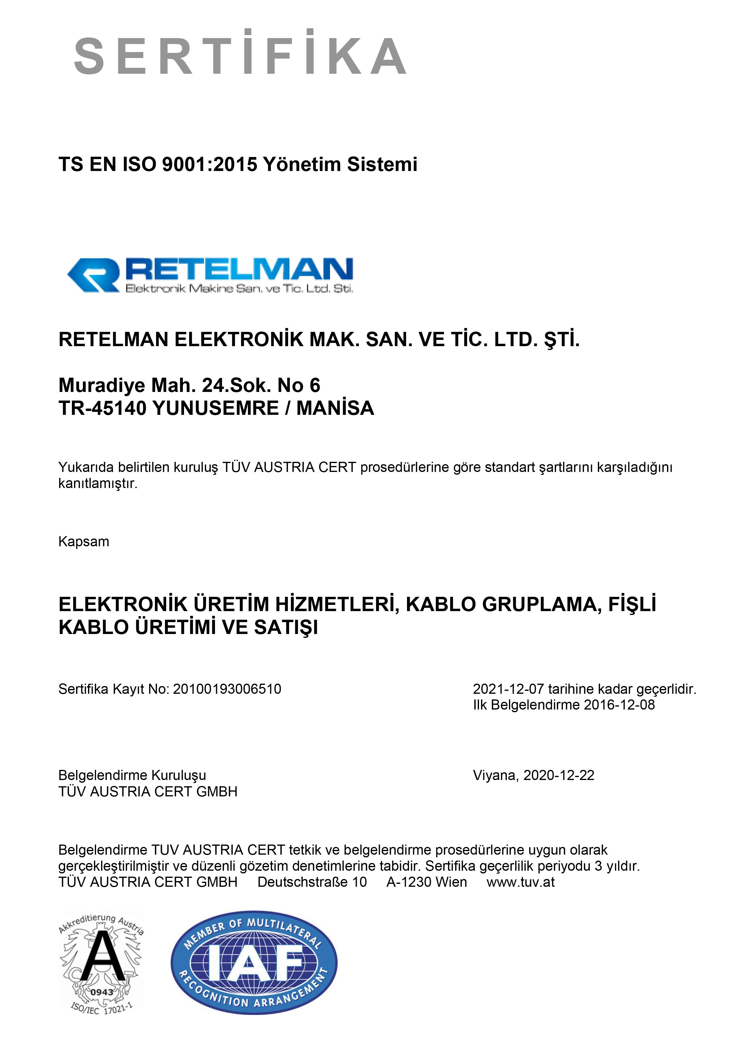 Müşteri memnuniyeti ve kalite odaklı çalışan Retelman Elektronik, marka tescilinden ISO 9001:2015 kalite belgelerine değin yeterliliğini tescil ettirmiş ve müşterilerine bu yeterliliklerin ve ciddi iş yönetimi prensiplerinin ışığında hizmet vermeye devam edegelmiştir.
