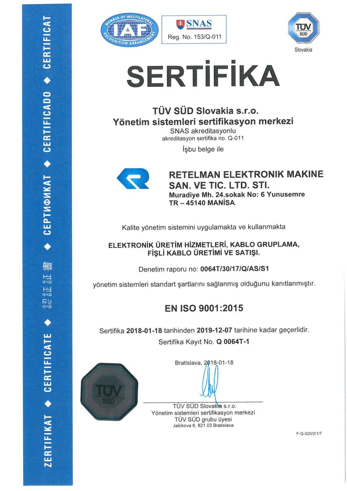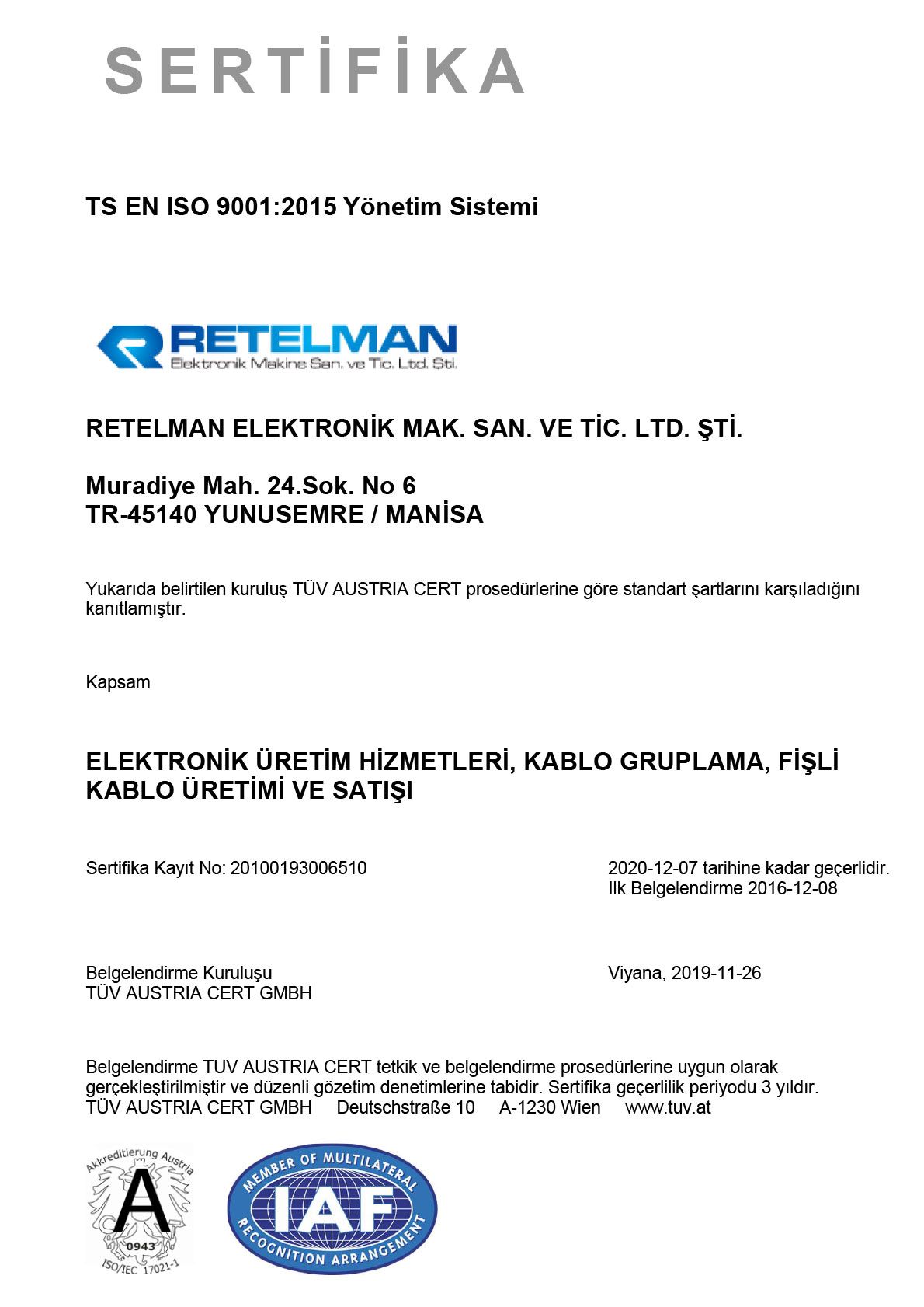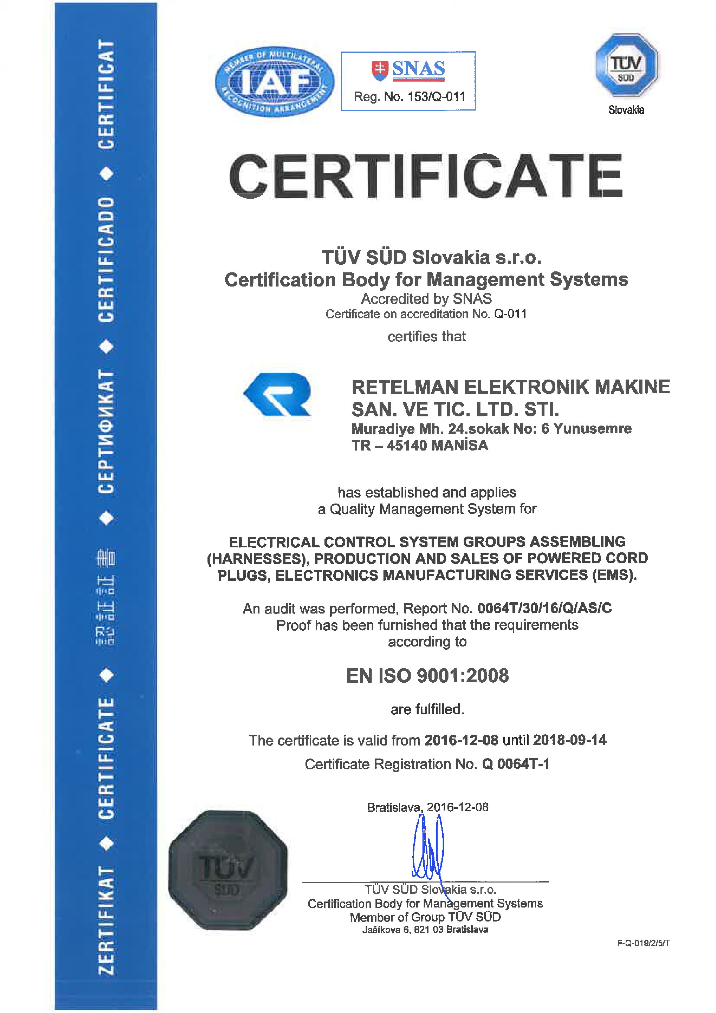 Müşteri memnuniyeti ve kalite odaklı çalışan Retelman Elektronik, marka tescilinden ISO 9001:2015 kalite belgelerine değin yeterliliğini tescil ettirmiş ve müşterilerine bu yeterliliklerin ve ciddi iş yönetimi prensiplerinin ışığında hizmet vermeye devam edegelmiştir.